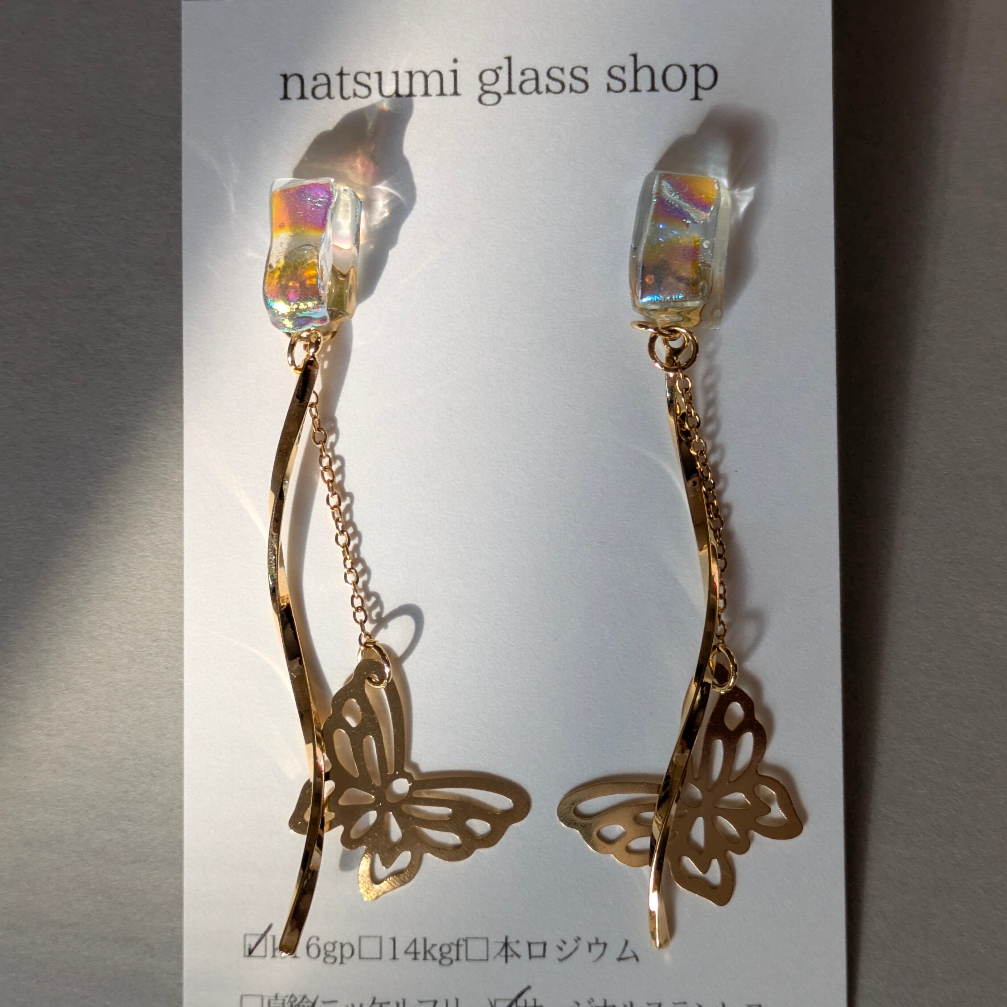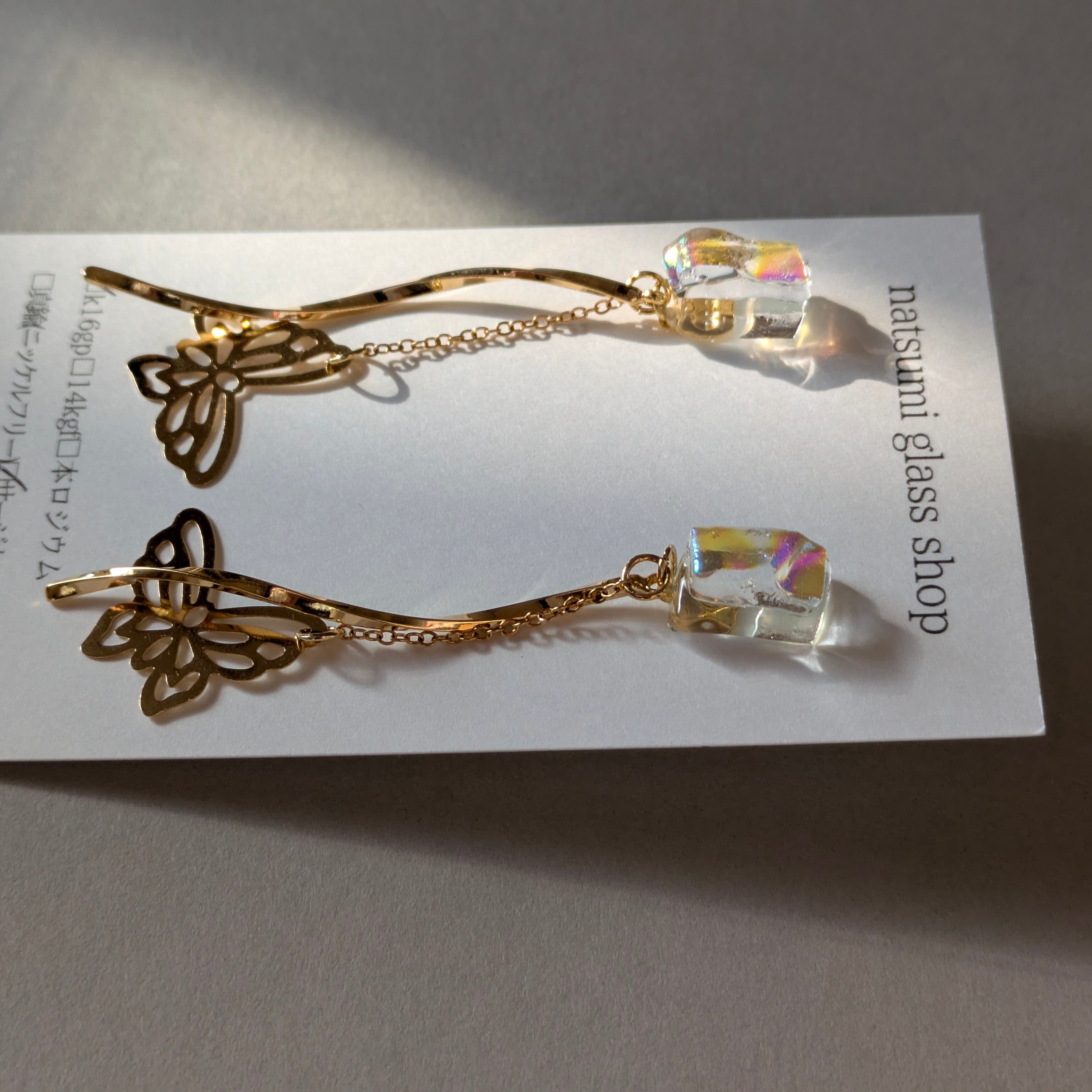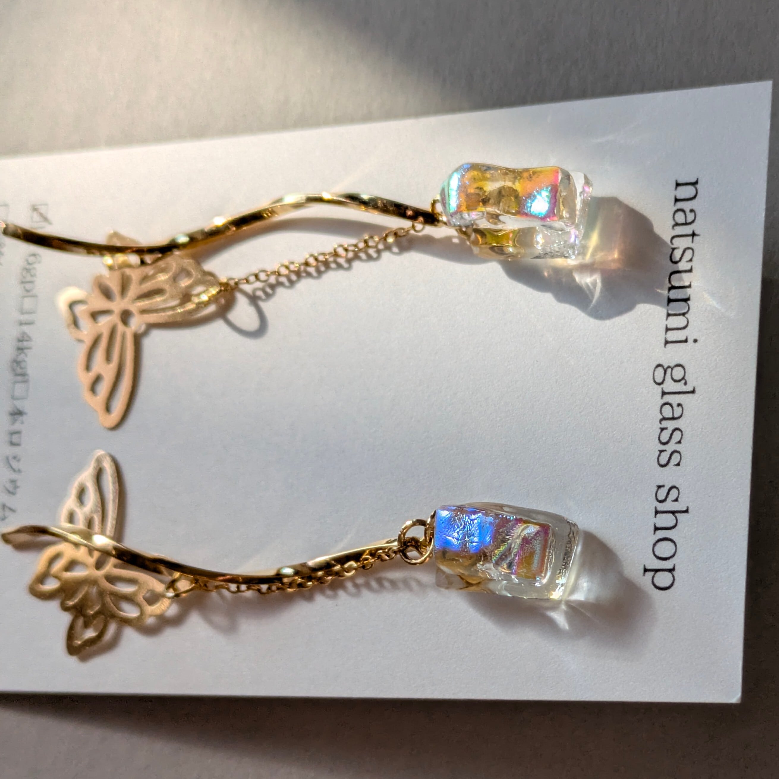④泡沫(うたかた)の輝き|クリア×ダイクロガラスのピアス・ゆらゆら揺れる蝶々つき〈限定〉