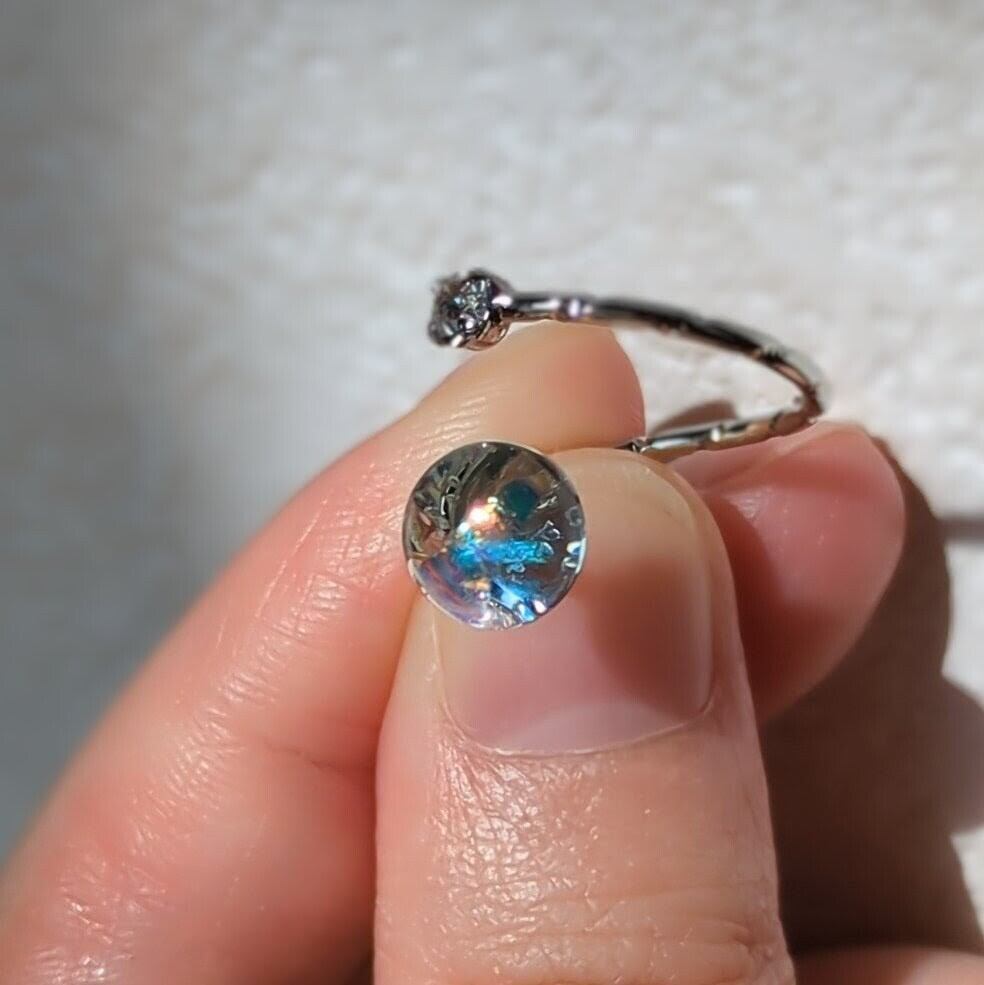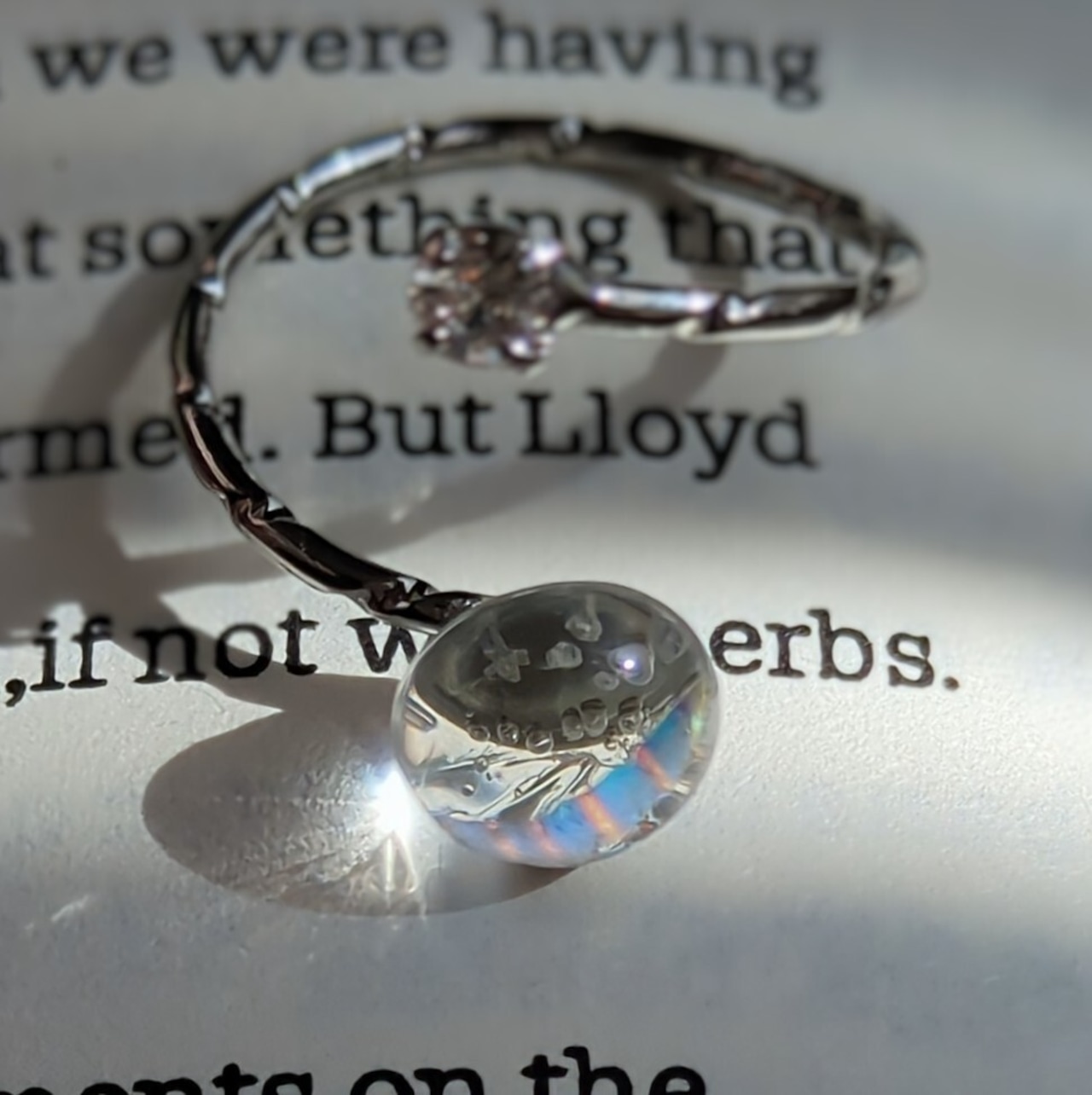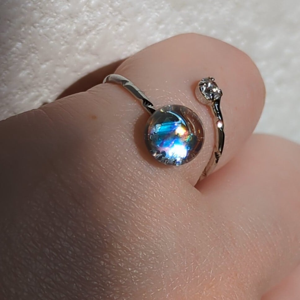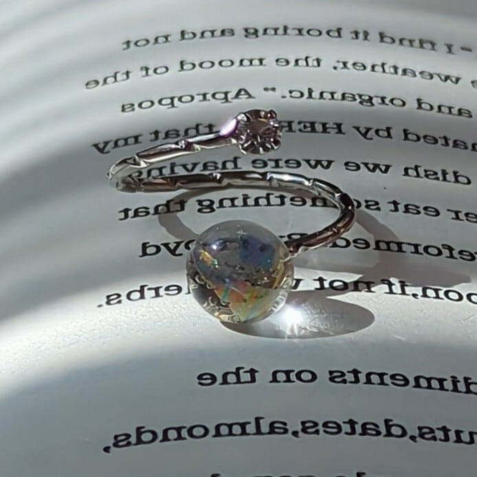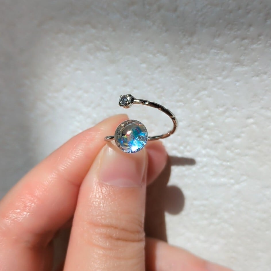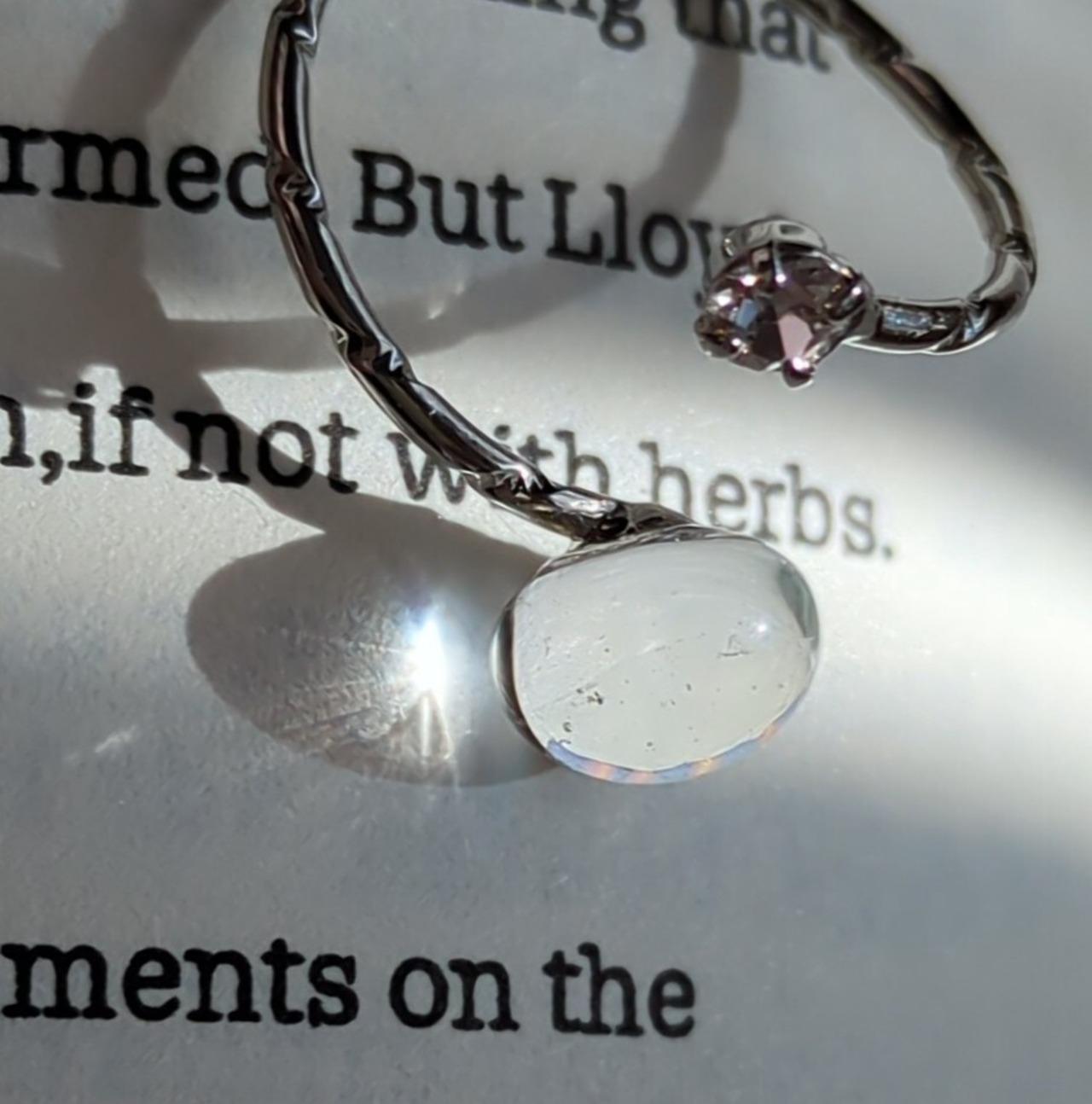 ダイクロガラスをあえて重ねすぎず、一筋の光が宿るように仕立てたリングです。