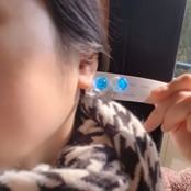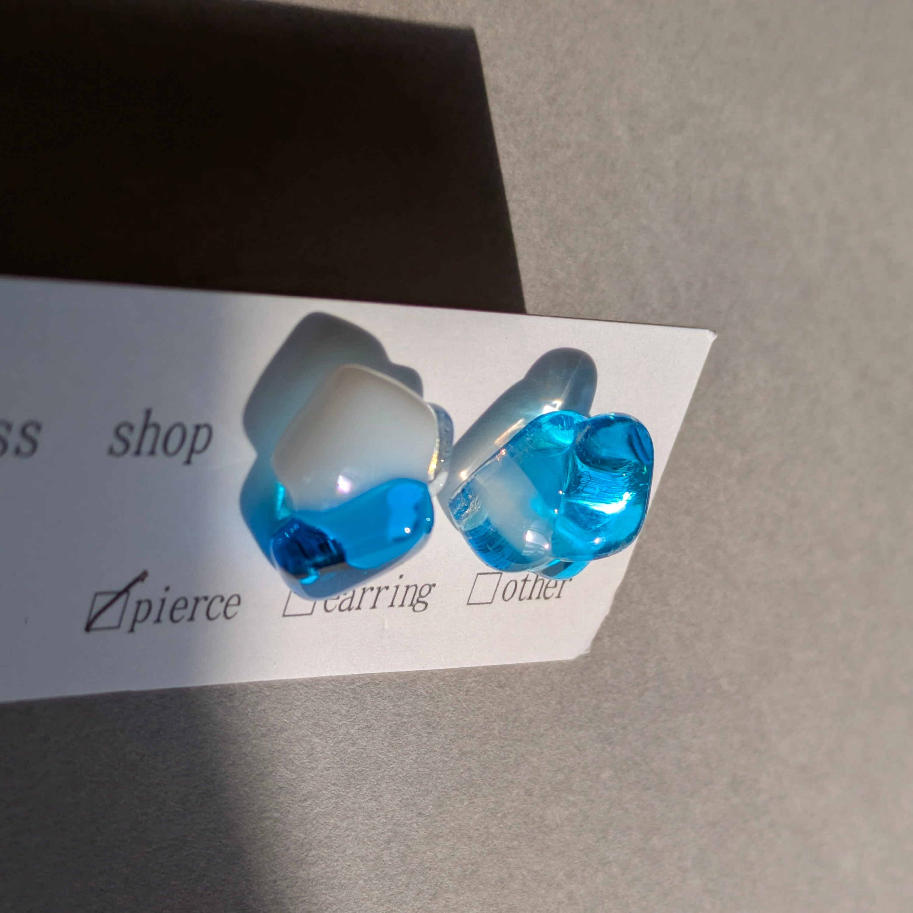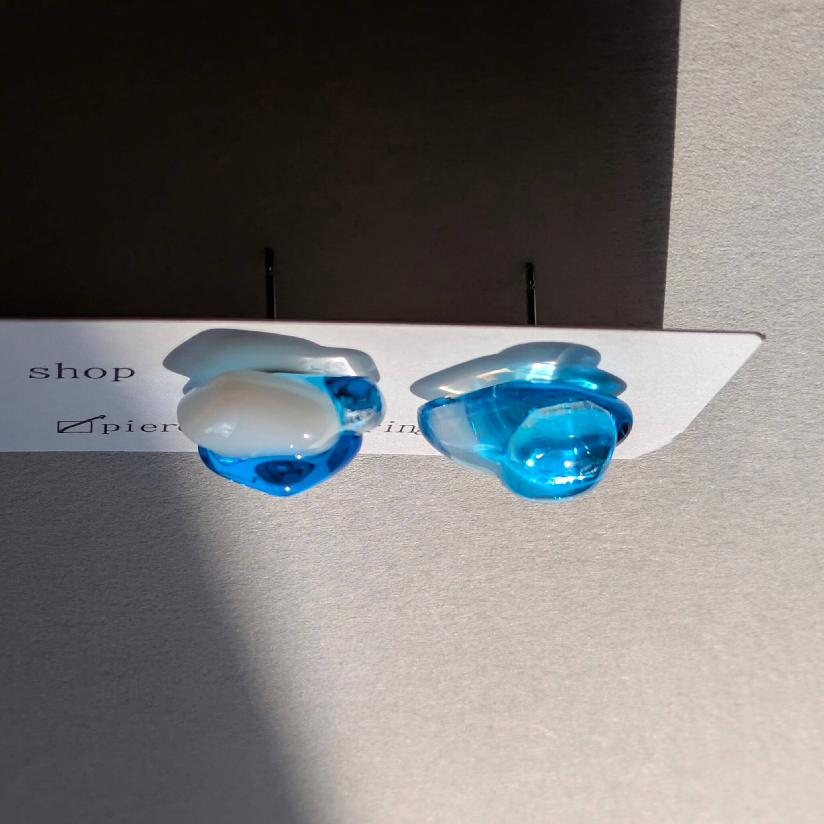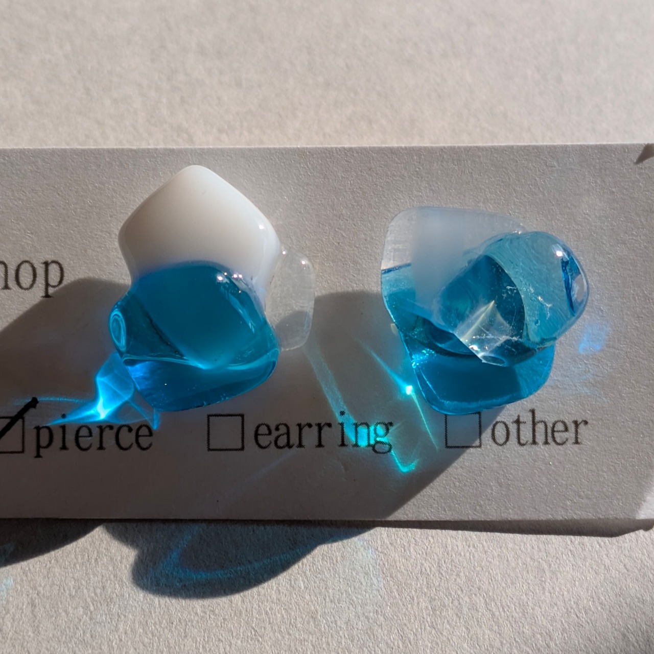 ホワイト、アクアブルー、虹色ガラスを立体的に重ねて熔かしたピアスです。