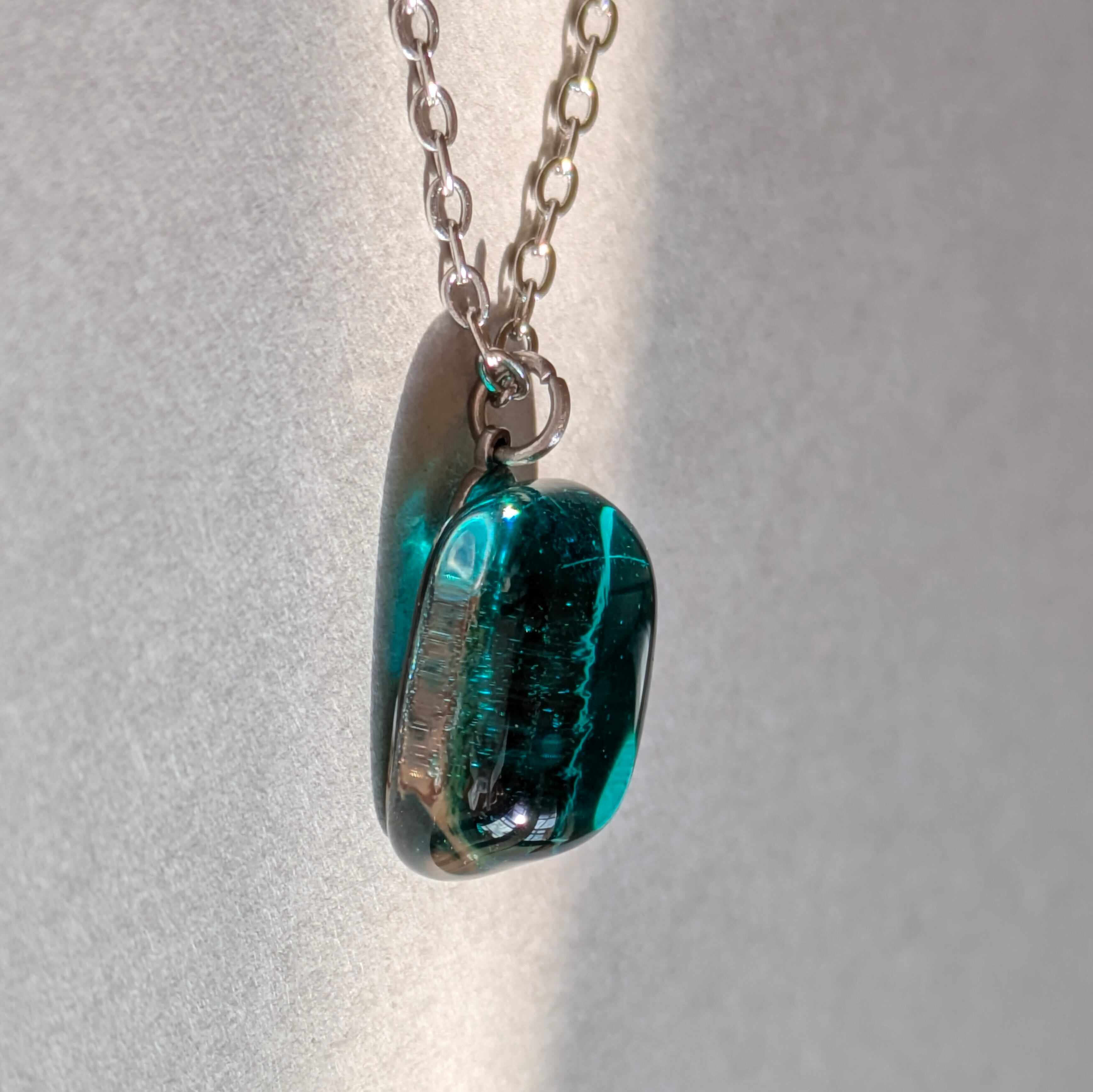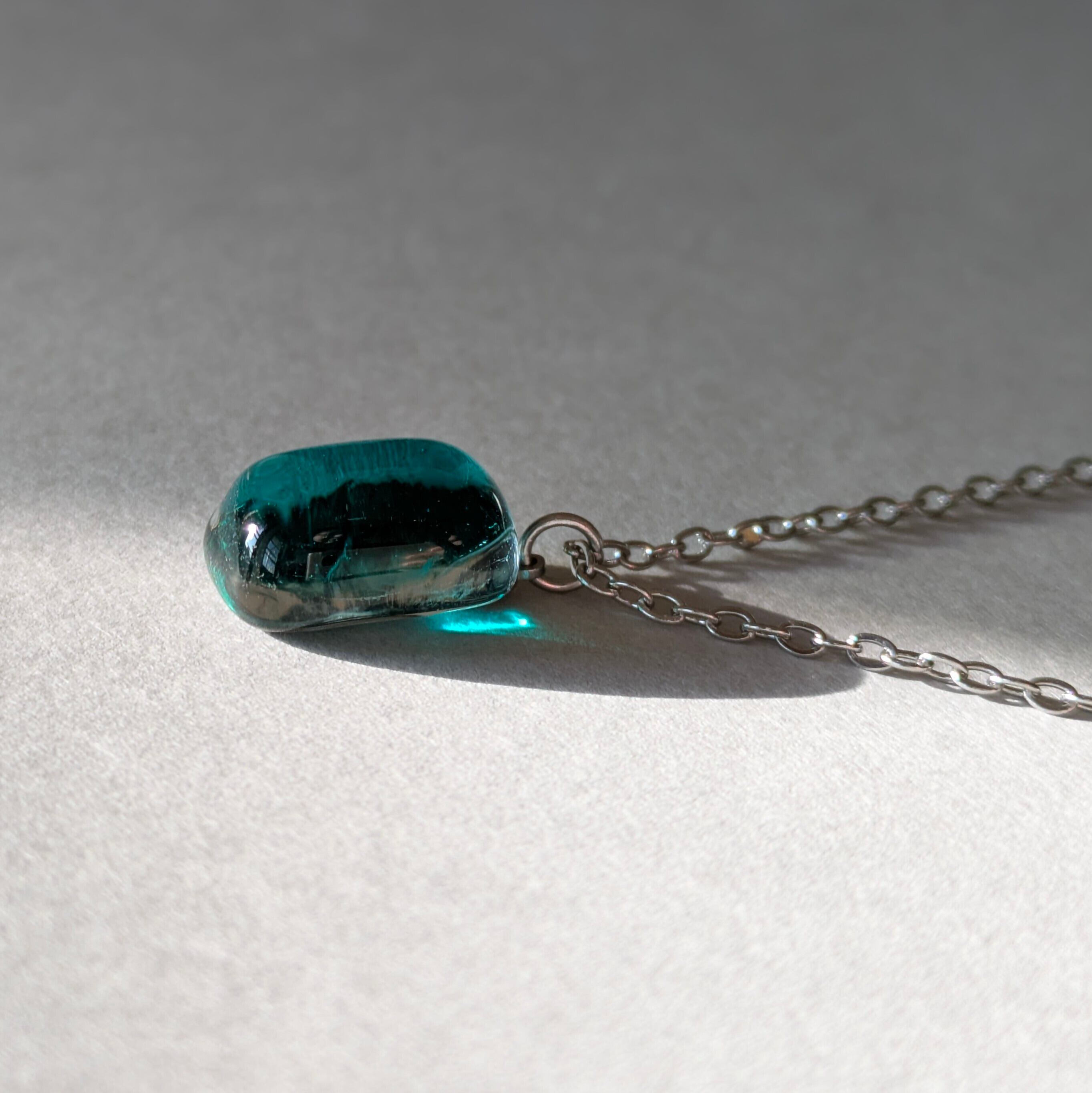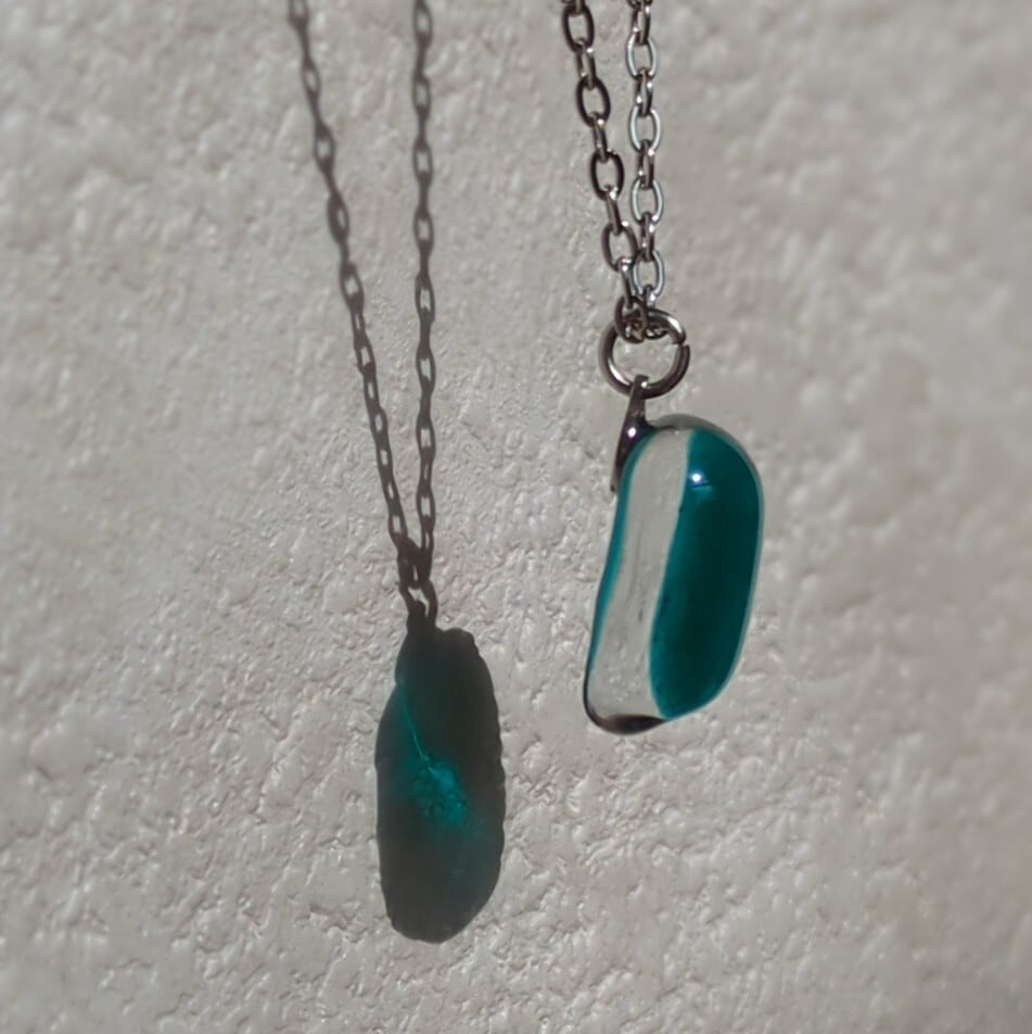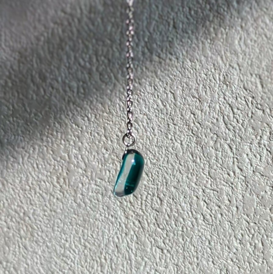 このネックレスは、そんな記憶をもとにグリーンのガラスとクリアガラスを2層に重ねて作りました。