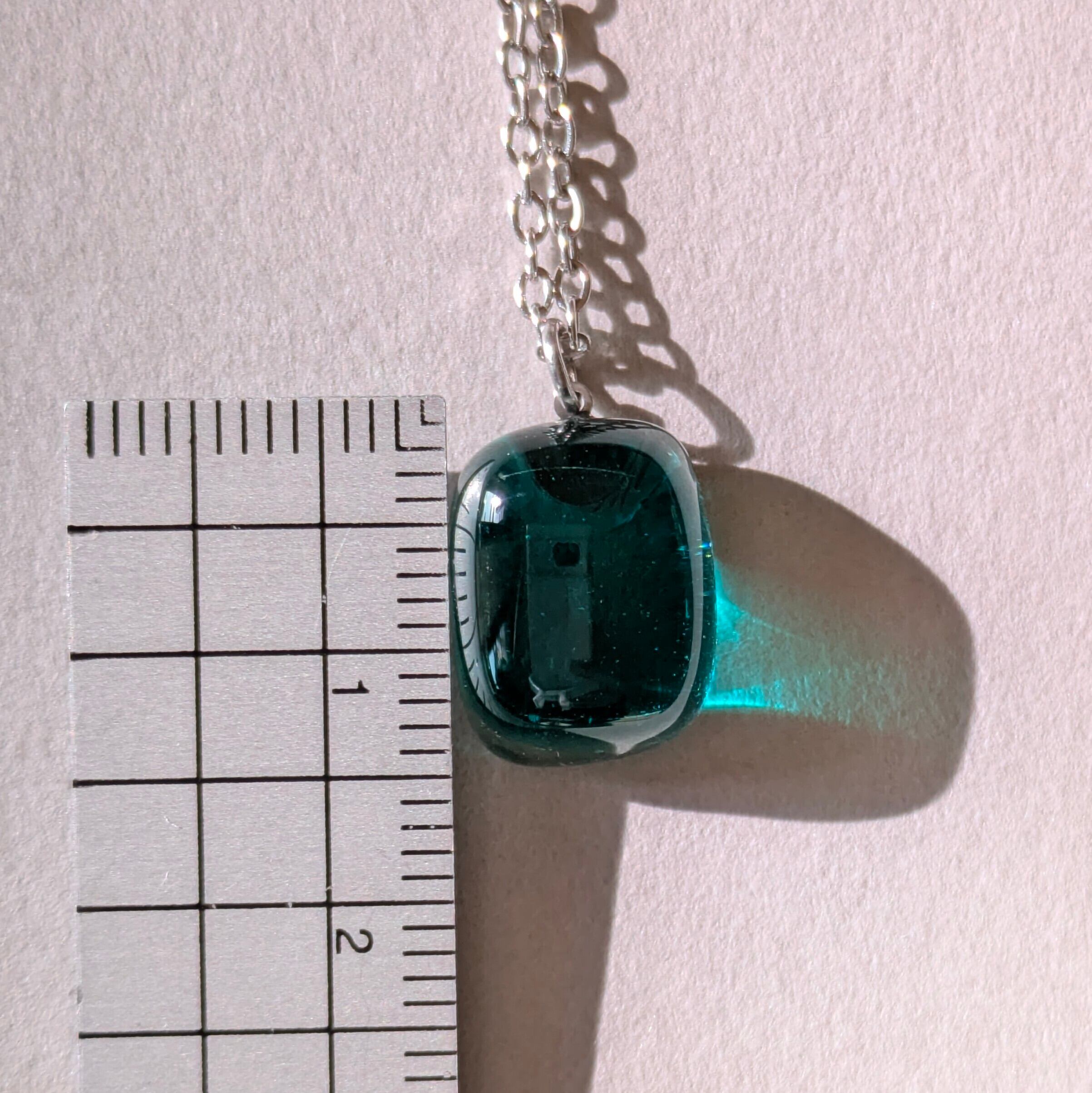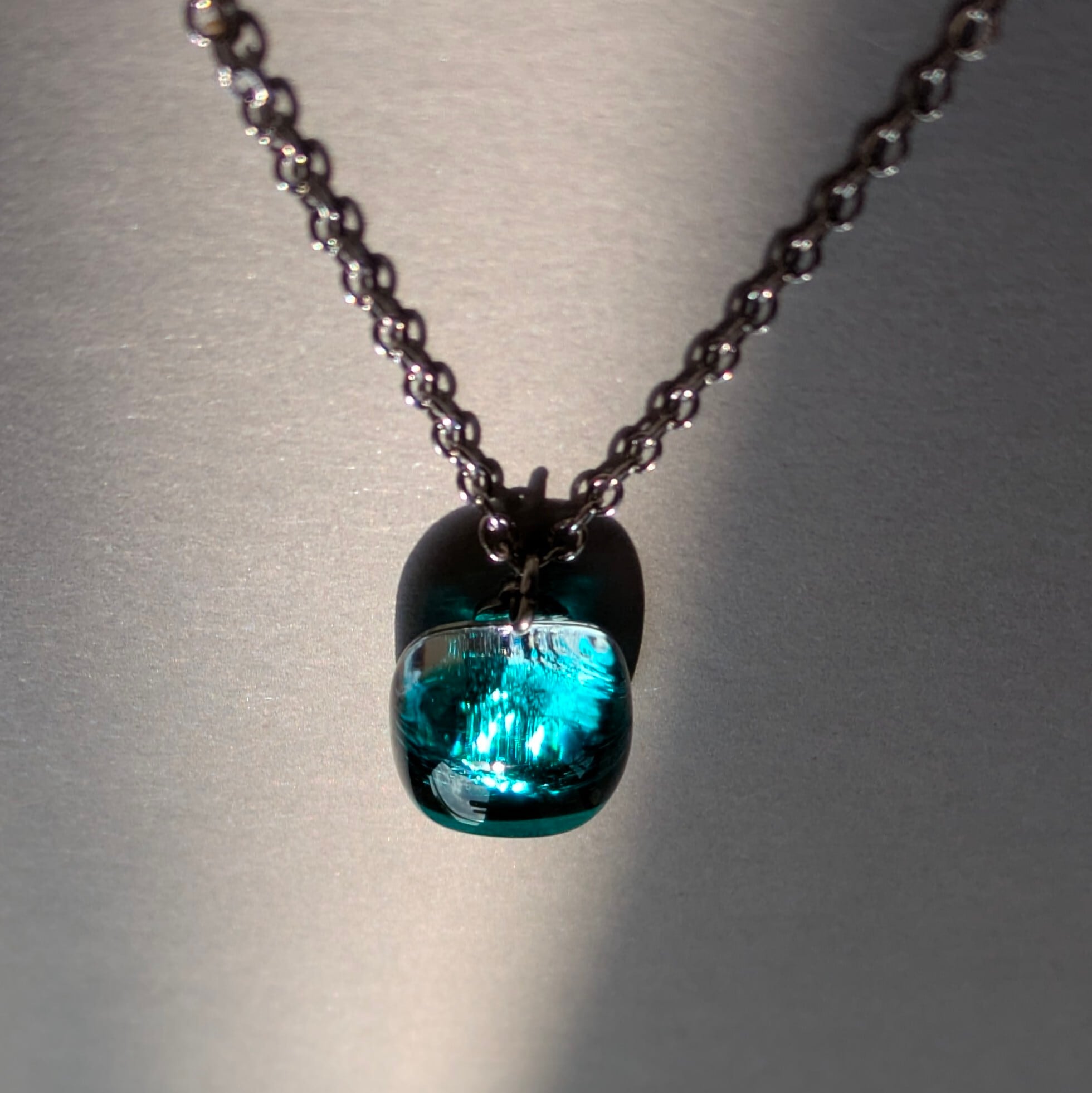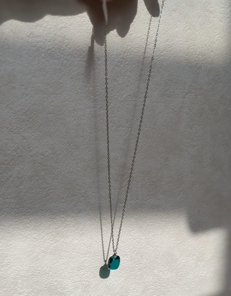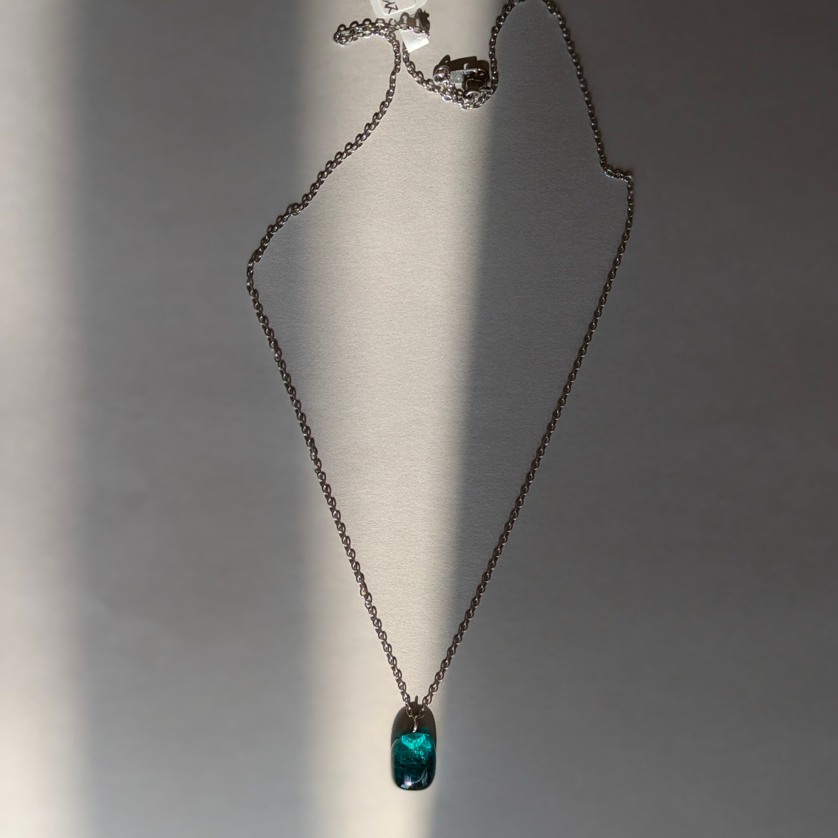 このネックレスは、そんな記憶をもとにグリーンのガラスとクリアガラスを2層に重ねて作りました。