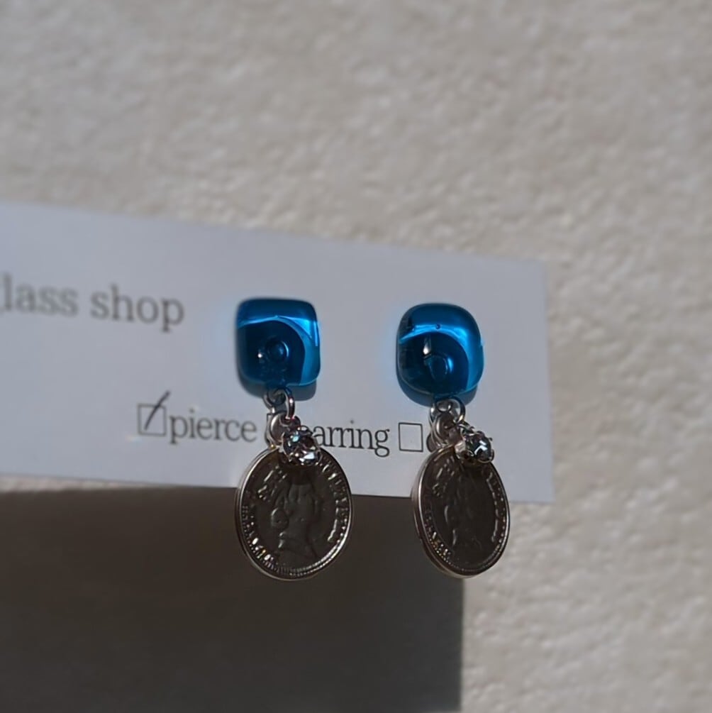 澄んだライトターコイズブルーのガラスに、マットシルバーのコインを添えました。