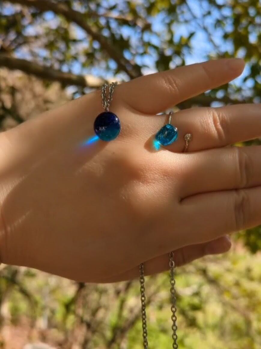 アクアブルーとシーディクリア(気泡入り)、2色のガラスを重ねたリングです。