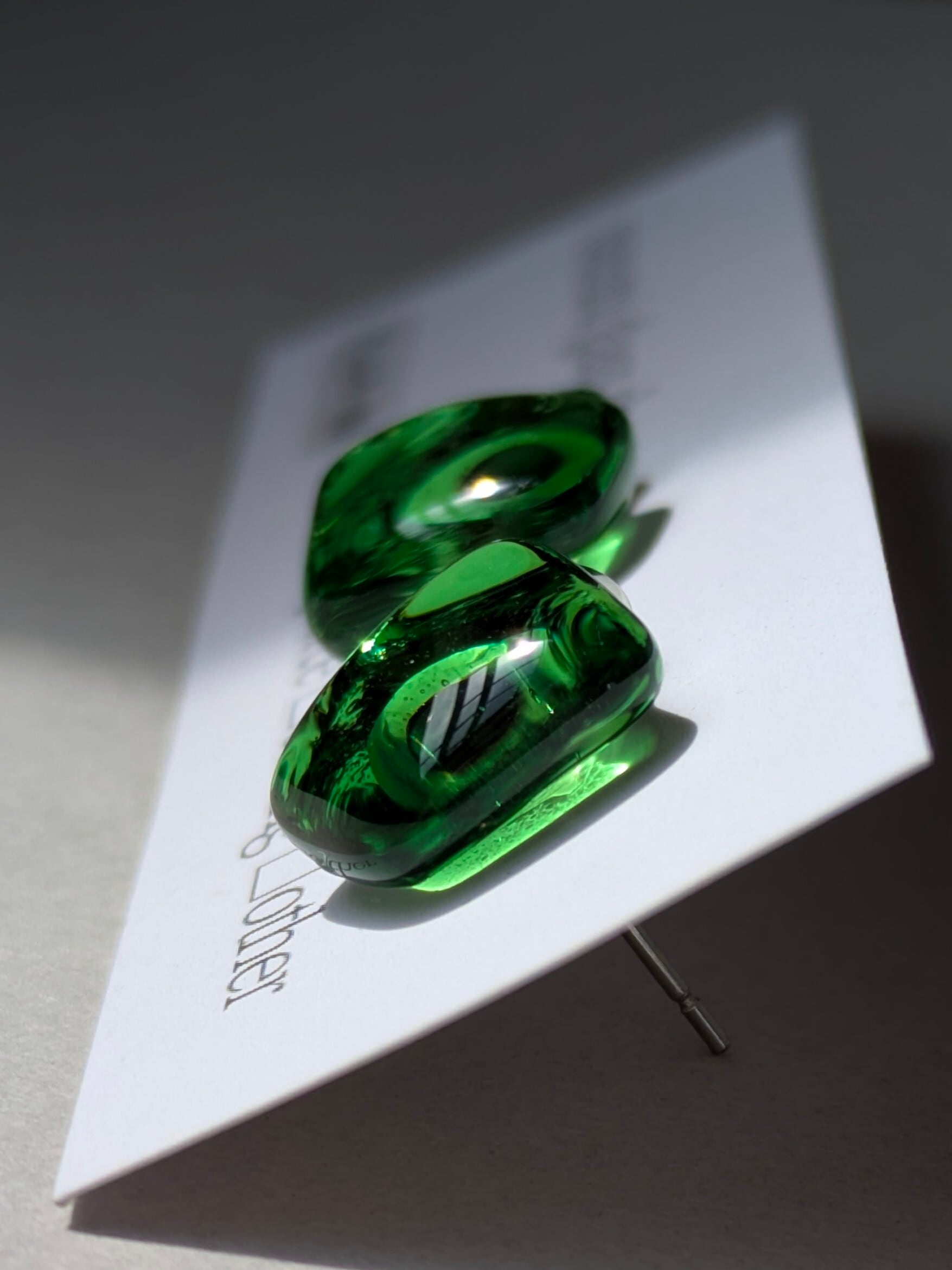 透明なガラスの中に、深い森の奥のような、落ち着いたグリーンの光を閉じ込めました。
