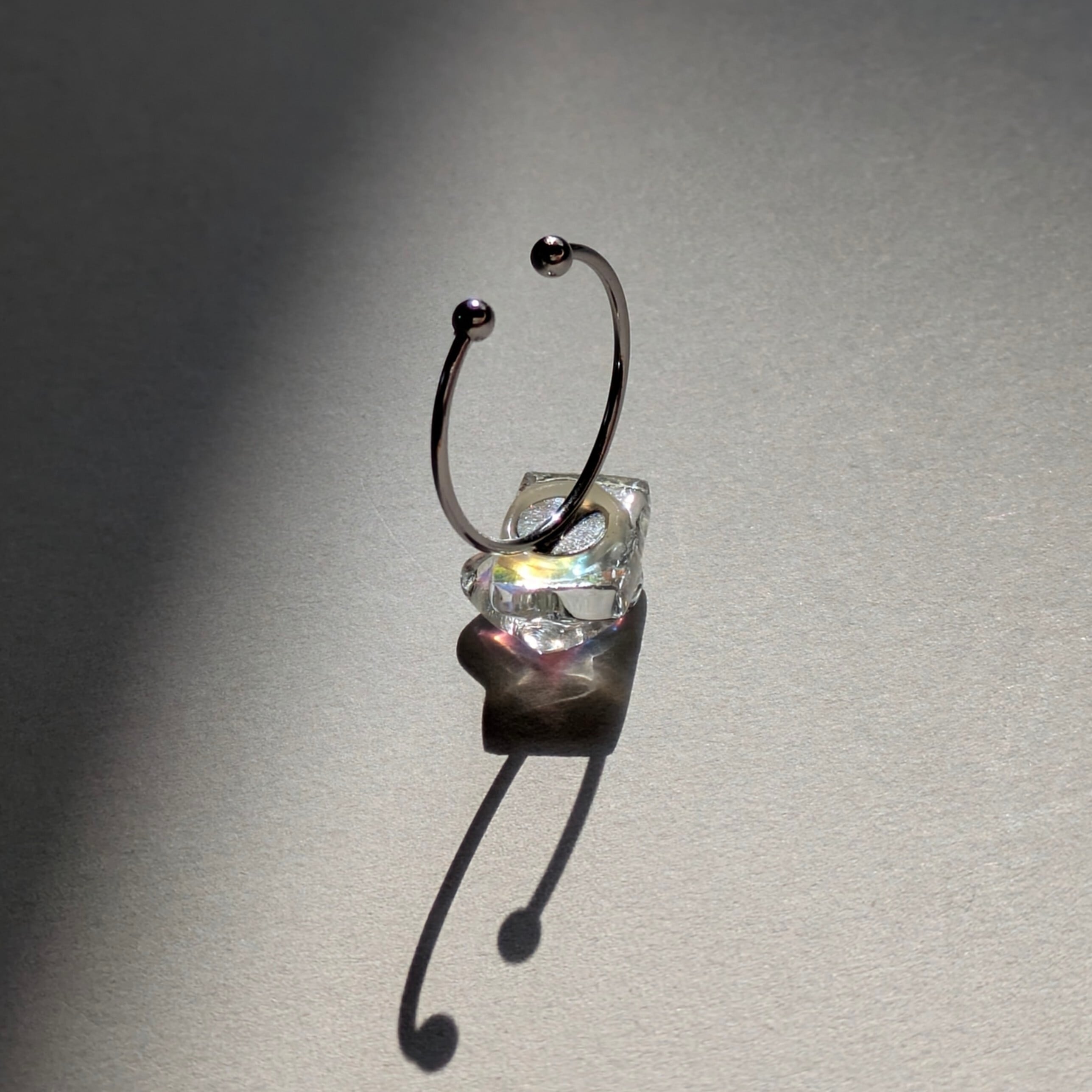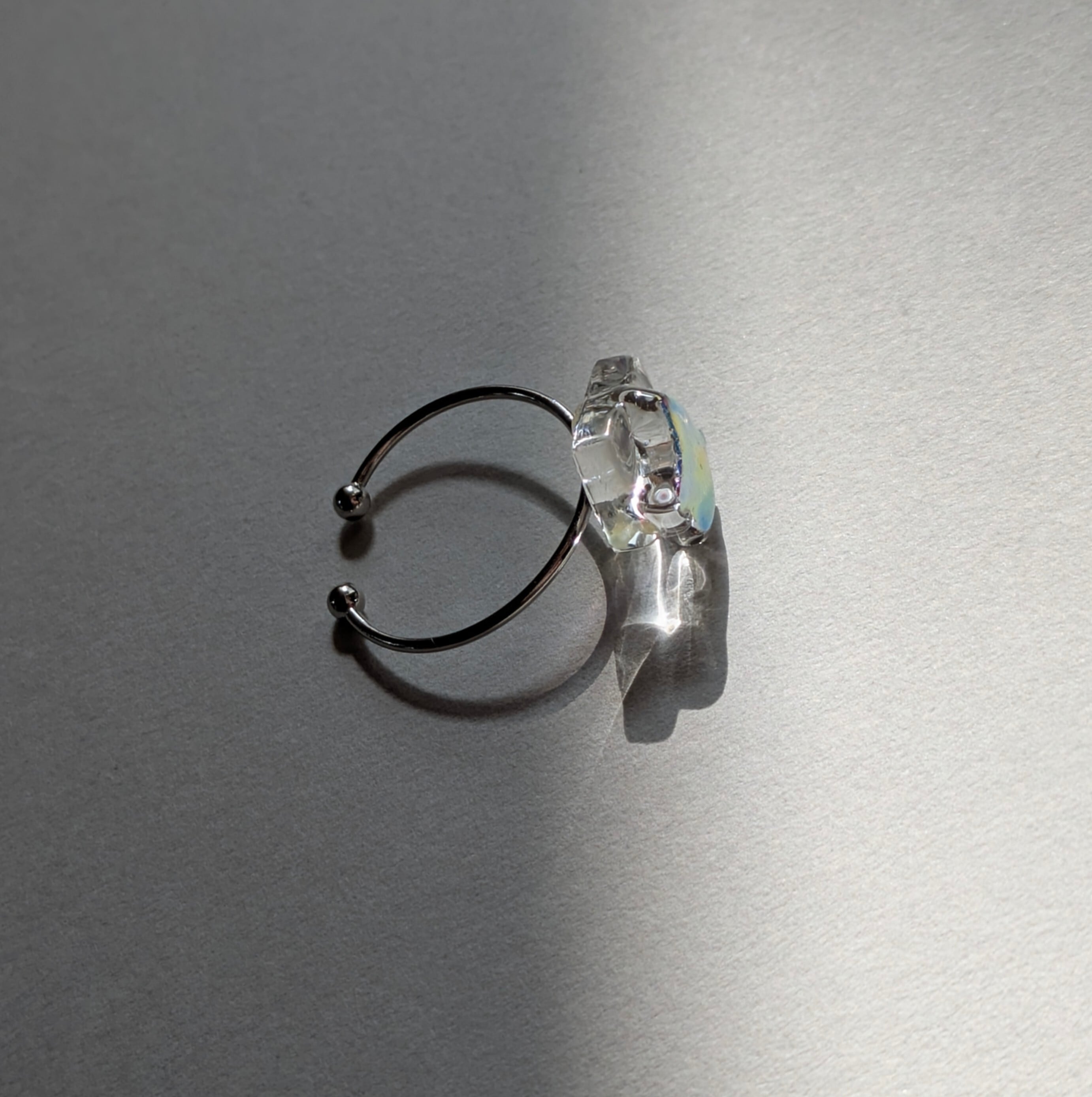 光の当たり方や角度によって色が変わり、まるで宇宙に瞬く星々のように輝くダイクロガラスを使用したリングです。